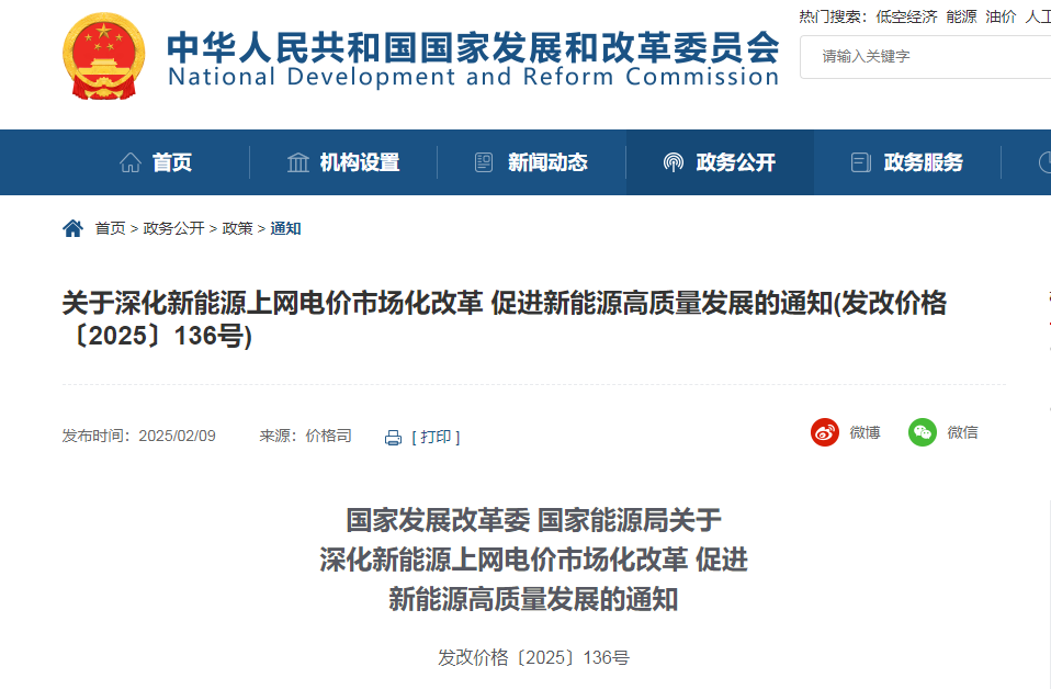 為貫徹落實黨的二十屆三中全會精神和黨中央、國務院關于加快構建新型電力系統、健全綠色低碳發展機制的決策部署,充分發揮市場在資源配置中的決定性作用,大力推動新能源高質量發展,現就深化新能源上網電價市場化改革有關事項通知如下。